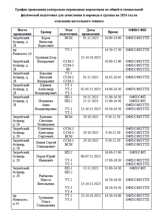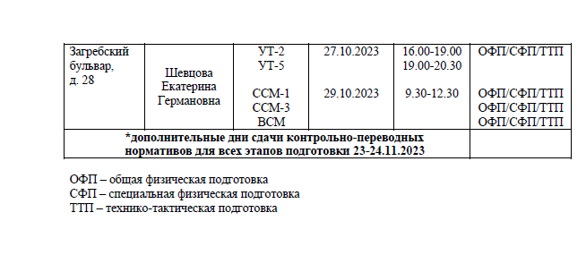 График проведения контрольно-переводных нормативов для зачисления и перевода в группы на 2026 учебно-тренировочный год