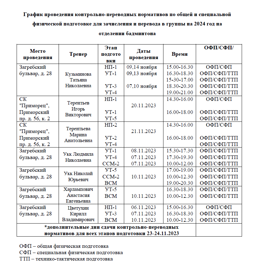 График проведения контрольно-переводных нормативов для зачисления и перевода в группы на 2026 учебно-тренировочный год