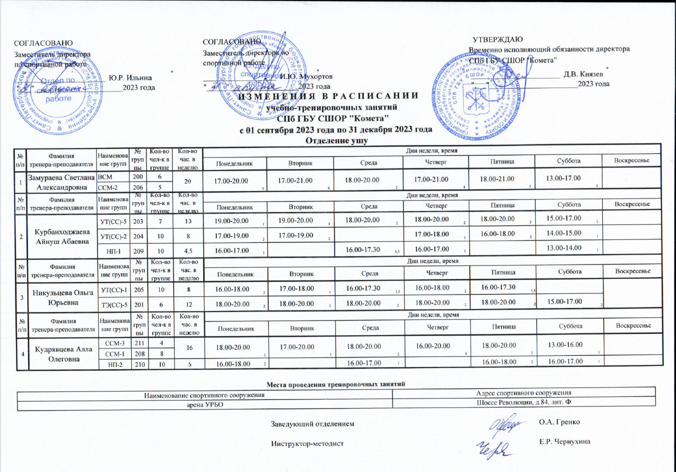 Расписание занятий отделения ушу с 01 сентября 2025 по 31.12.2025