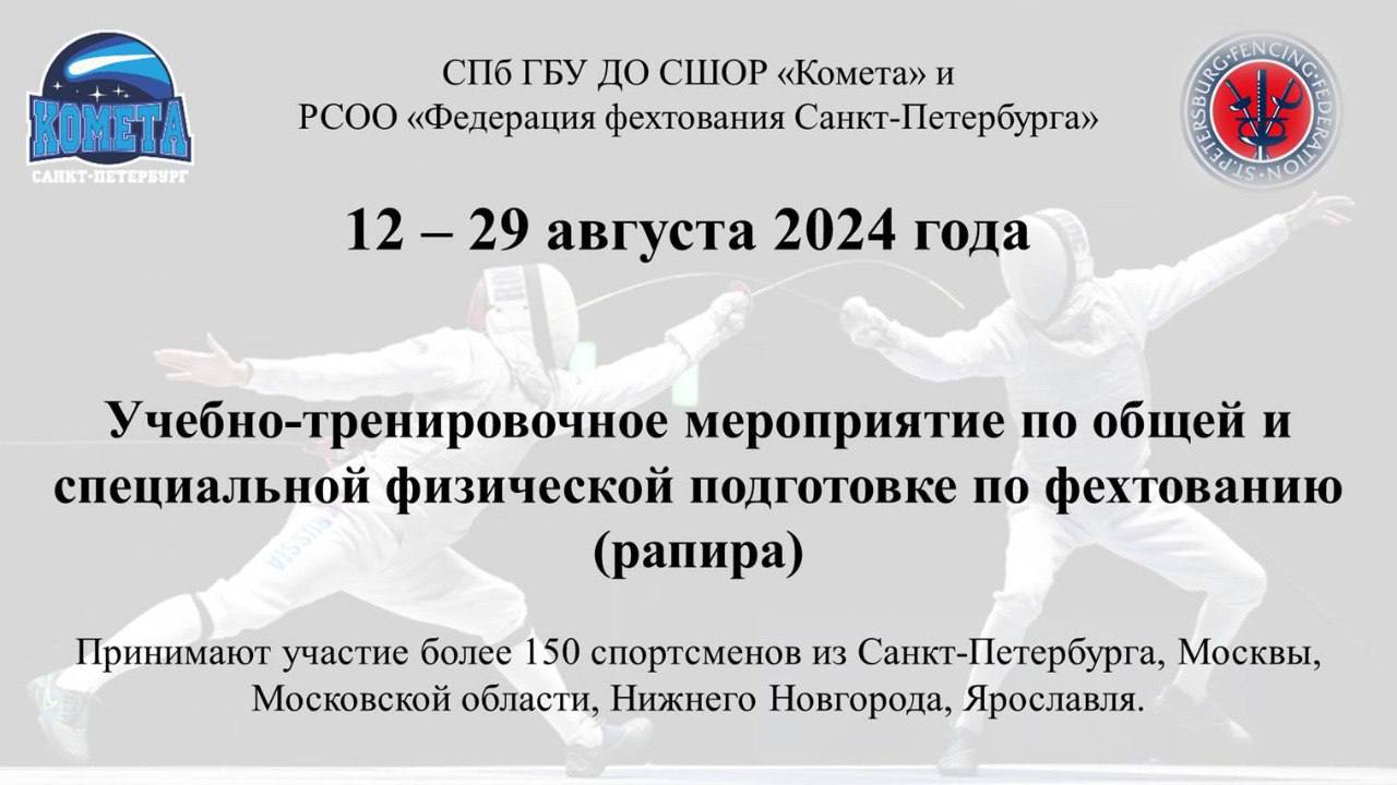 С 12.08.2024 по 29.08.2024 СПб ГБУ ДО СШОР «Комета» и РСОО «Федерация фехтования Санкт-Петербурга» организуют учебно-тренировочное мероприятие по общей и специальной физической подготовке по фехтованию (рапира) на базе многофункционального комплекса СПб ГБУ ДО СШОР «Комета» (Загребский б-р д.28) и Академии хоккея им. Валерия Харламова (ул. Пражская, д.10, к.2).