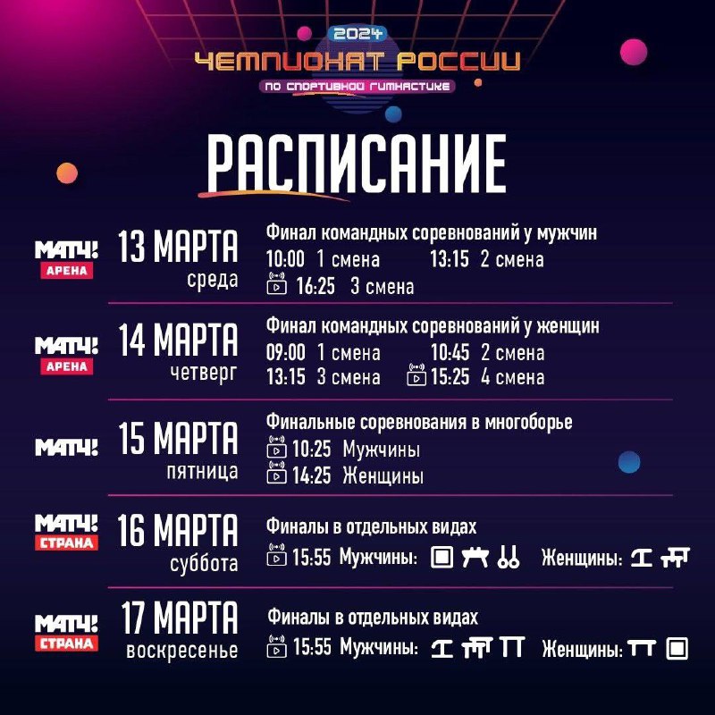 С 11 по 18 марта в п.г.т. Сириус (Краснодарский край) состоится Чемпионат России по спортивной гимнастике. Более 150 сильнейших спортсменов страны, среди которых олимпийские чемпионы Токио, чемпионы мира и Европы будут соревноваться за 14 комплектов наград!