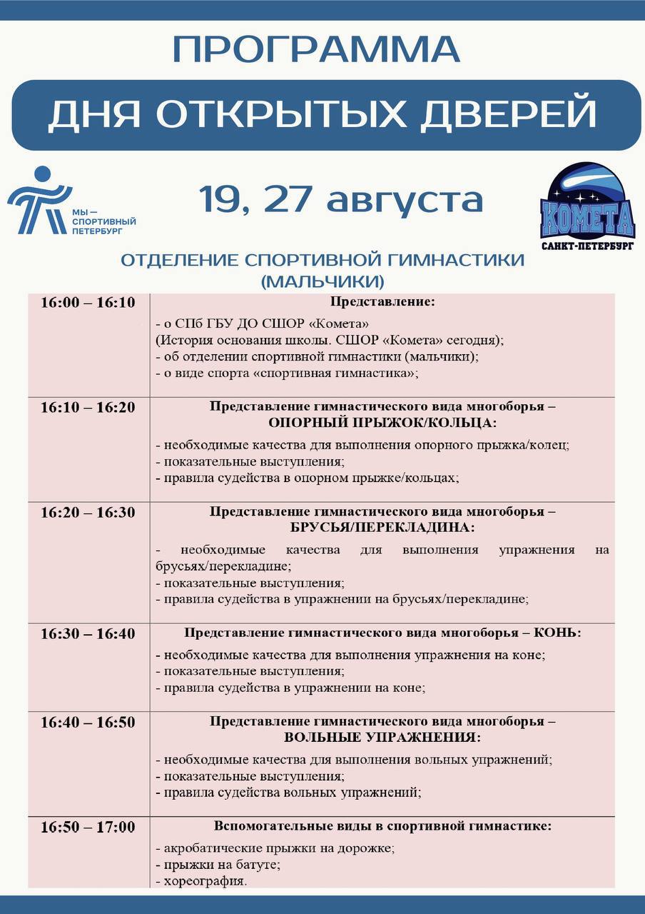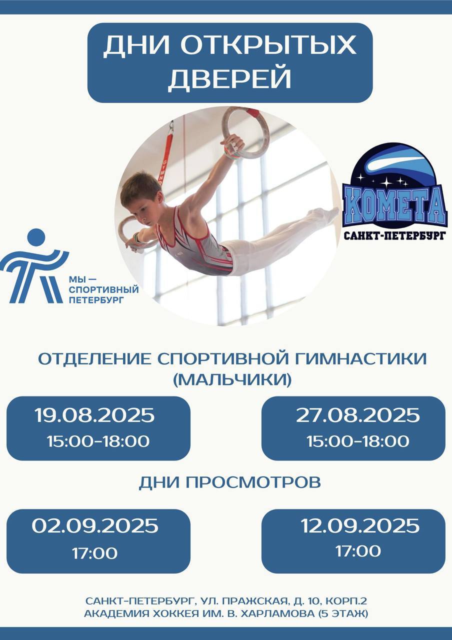 СПб ГБУ ДО СШОР «Комета» приглашает на Дни открытых дверей отделения спортивной гимнастики (мальчики) 19 и 27 августа по адресу: ул. Пражская, д. 10, корп. 2 (5 этаж) Академия хоккея им. В. Харламова.