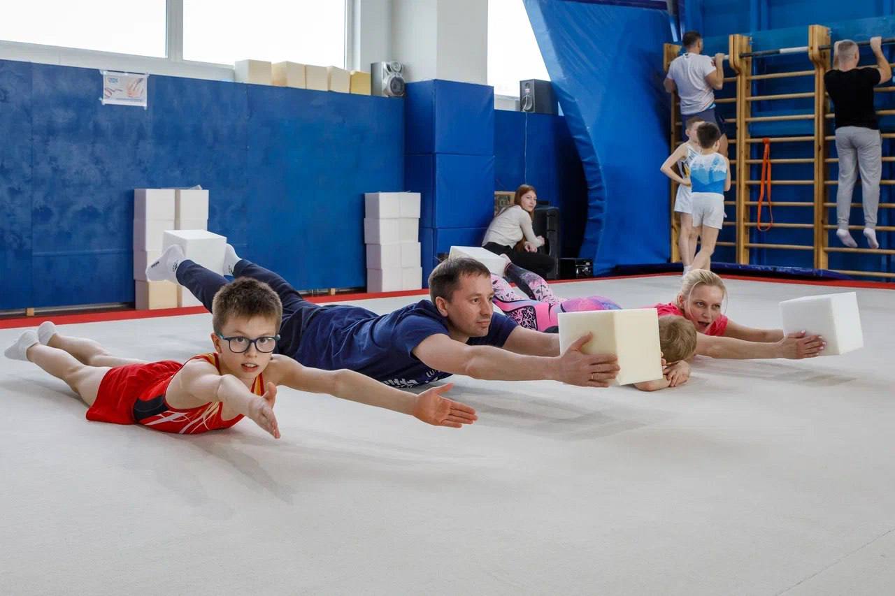 Юные гимнасты совместно со своими родителями, бабушками, сестрами и братьями провели разминку и круговую тренировку со специальными гимнастическими упражнениями.