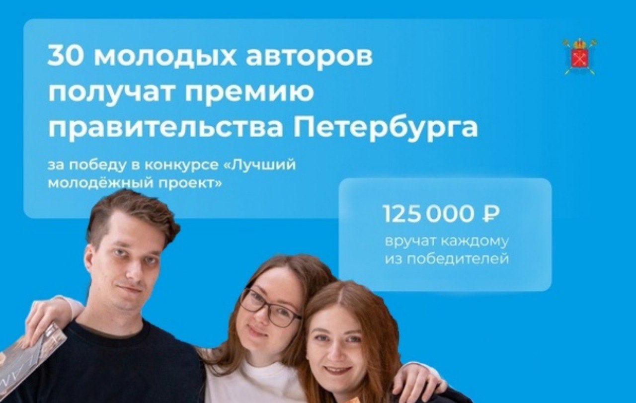 Конкурс «Лучший молодежный проект Санкт-Петербурга» ждет победителей Авторы 30 лучших проектов получат премию Правительства Санкт-Петербурга в размере 125 тысяч рублей. Регистрация на ежегодный конкурс уже идет. Подать заявку можно до 11 июня 2024 г. Поучаствовать могут граждане в возрасте от 14 до 35 лет, проживающие на территории Петербурга, имеющие регистрацию (постоянную или временную) в Санкт‑Петербурге.