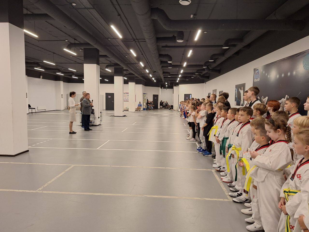 На линейке присутствовали обучающиеся спортивной гимнастики, фехтования, тхэквондо, брейкинга.
