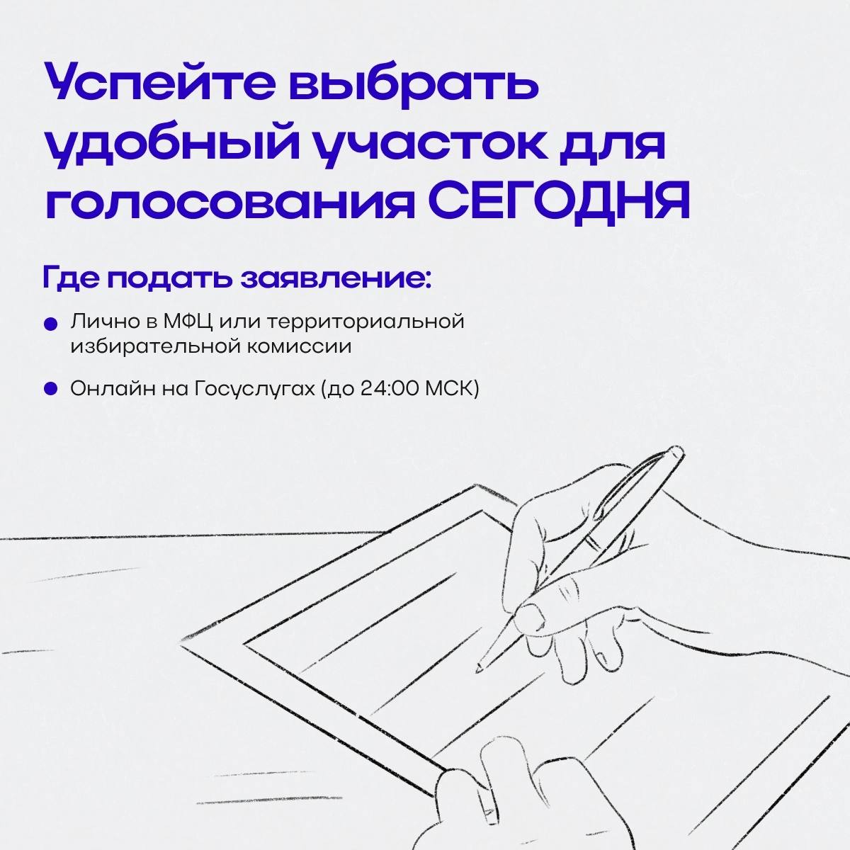 Обратите внимание — сегодня последняя возможность внести изменения. Оформить заявление о смене избирательного участка можно онлайн до 24:00 по Московскому времени