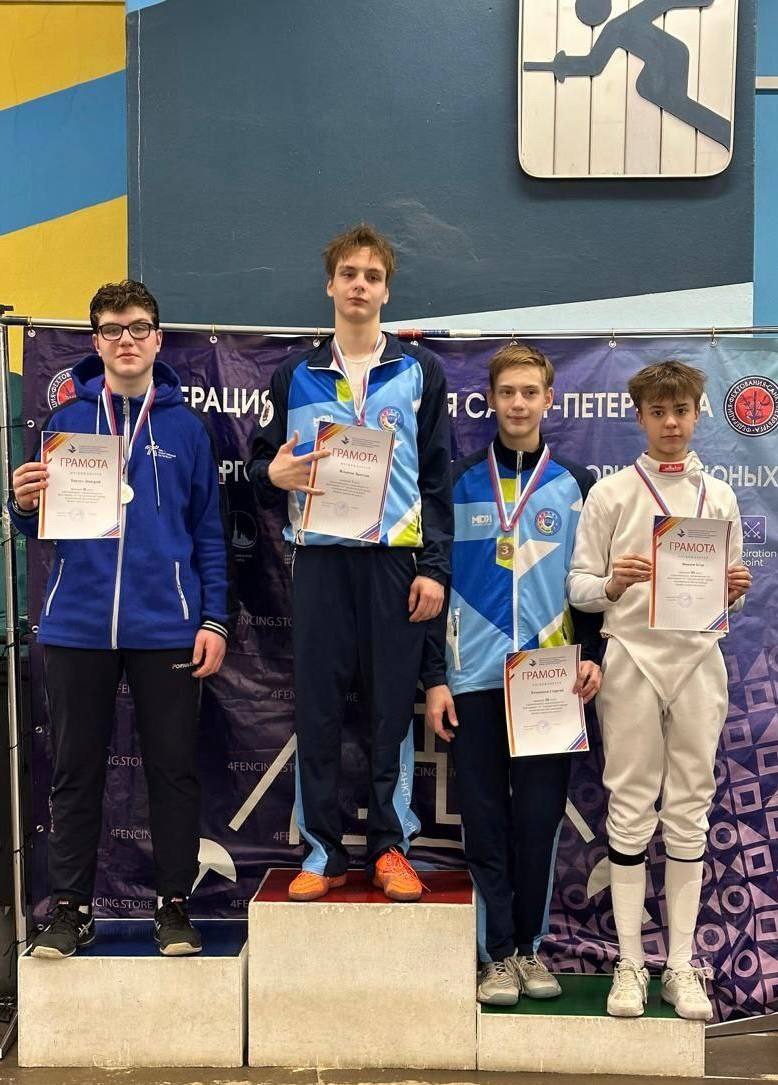 Юноши, рапира лично — Танчук Дмитрий занял 2 место (Старший тренер-преподаватель Пресс А.В., тренеры-преподаватели Овсянникова Е.О., Петрова Е.А., Филиппова М.П.)
