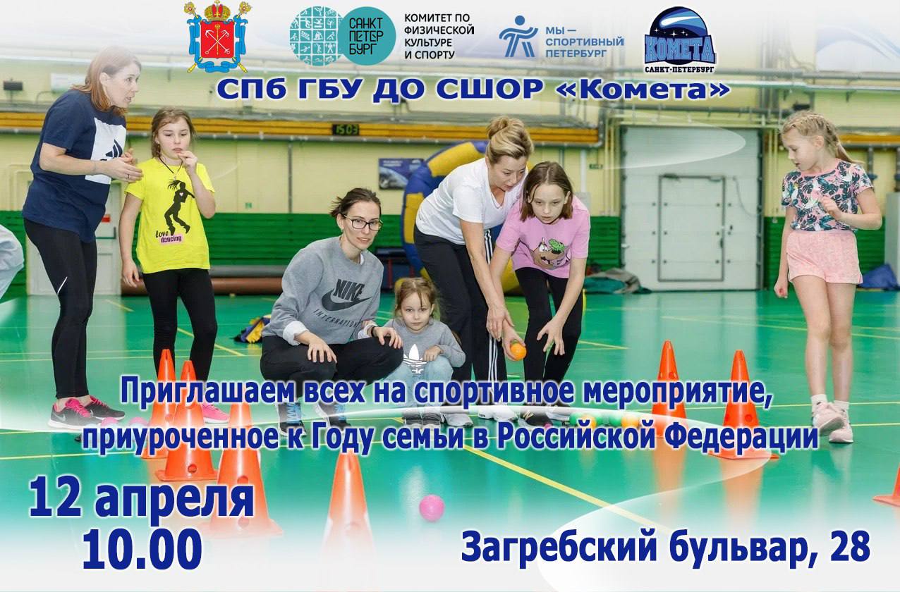 12 апреля в 10:00 по адресу: Санкт-Петербург, Загребский бульвар, д. 28 пройдет спортивное мероприятие, приуроченное к Году семьи в Российской Федерации.
