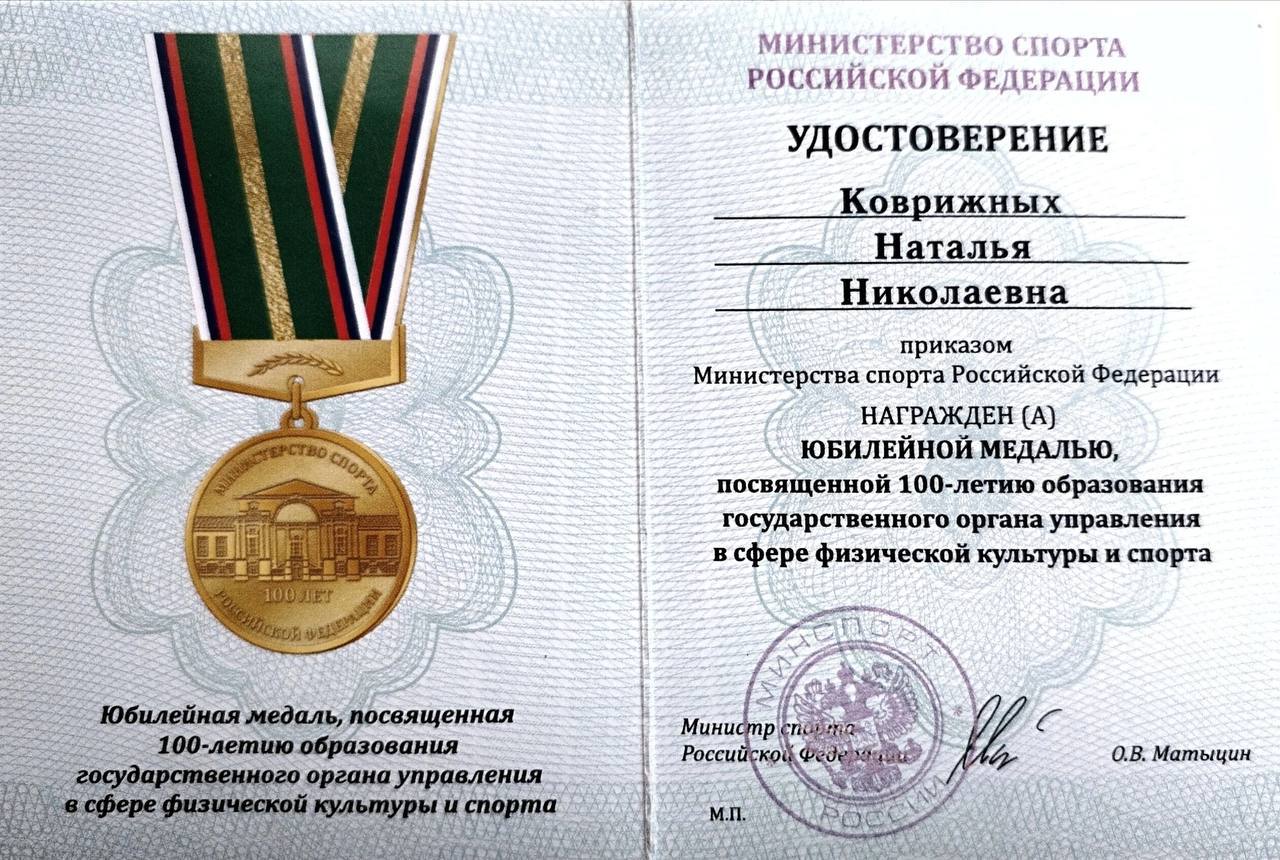 Приказом Министерства спорта РФ №490 нг от 12 декабря 2023 г. старший тренер-преподаватель отделения спортивной гимнастики Заслуженный тренер России Наталья Николаевна Коврижных награждена юбилейной медалью, посвящённой 100-летию образования государственного органа управления в сфере физической культуры и спорта!