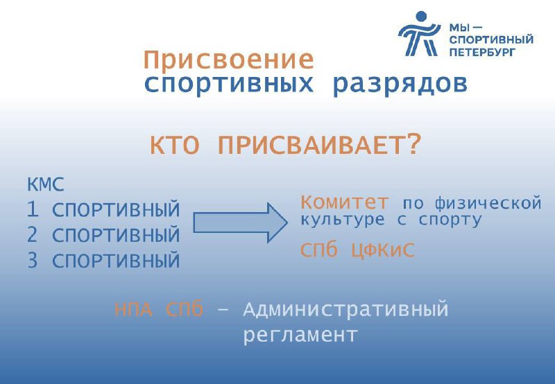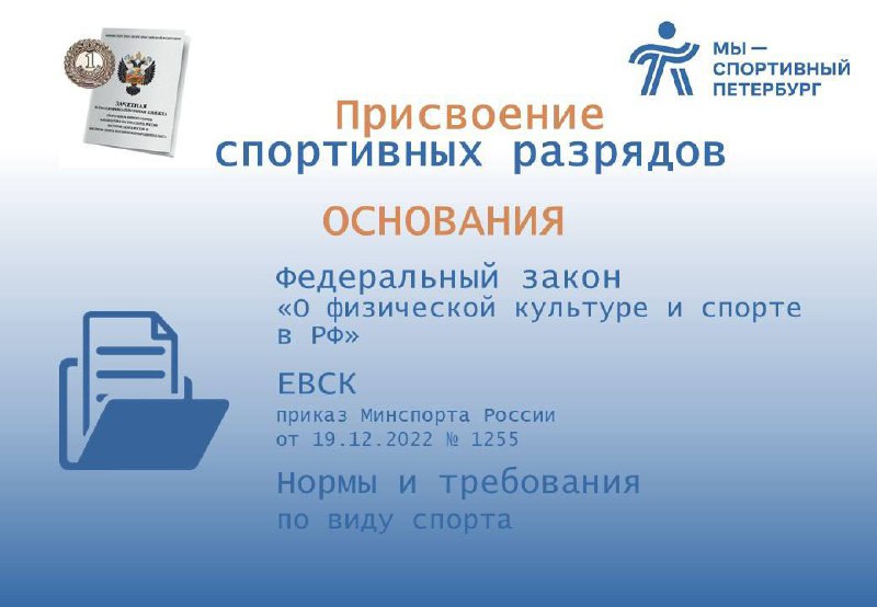 В Санкт-Петербурге разработан новый административный регламент на оказание государственной услуги по присвоению спортивных разрядов и квалификационных категорий спортивных судей, который вступит в силу с 3 апреля 2024 года.