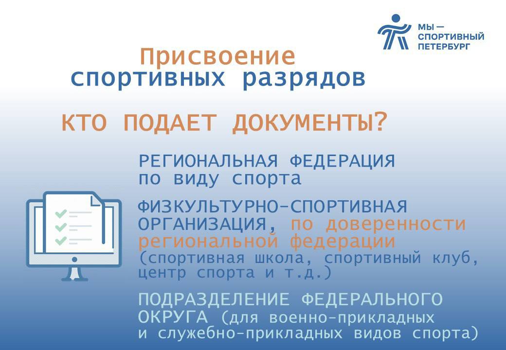 Кто может подать документы? – это региональная федерация по виду спорта; – подразделение федерального округа (для военно-прикладных и служебно-прикладных видов спорта); – также подать документы сможет спортивная школа, или иная физкультурно-спортивная организация (спортивный клуб, центр физической культуры, подростково-молодежный клуб, ШСК и др.) по доверенности, выданной региональной федерацией по виду спорта.
