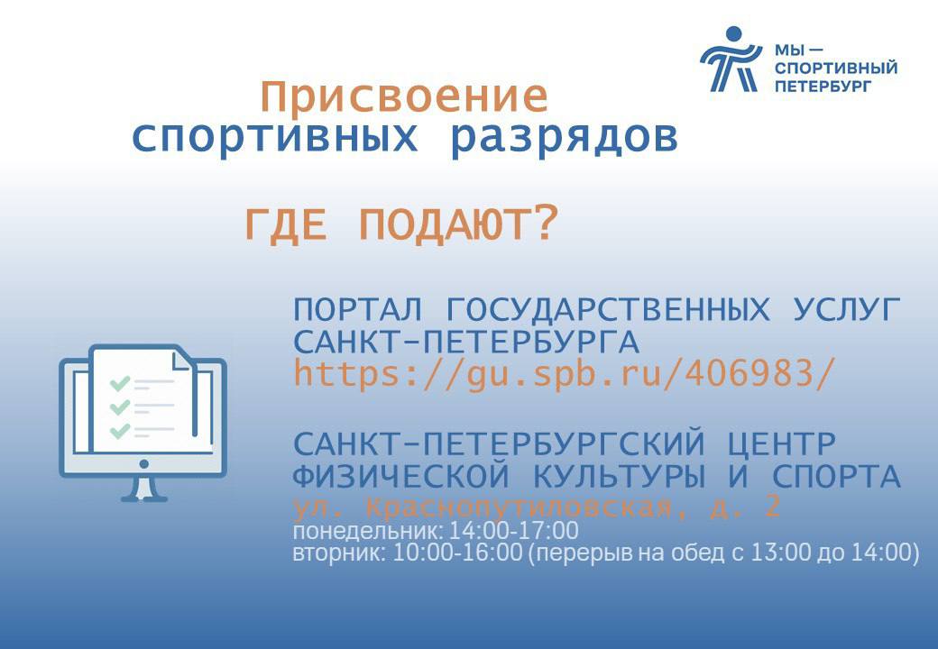 Для удобства подачи документов реализована возможность подачи через портал государственных и муниципальных услуг Санкт-Петербурга: https://gu.spb.ru/ раздел «Присвоение спортивных разрядов и квалификационных категорий спортивных судей».