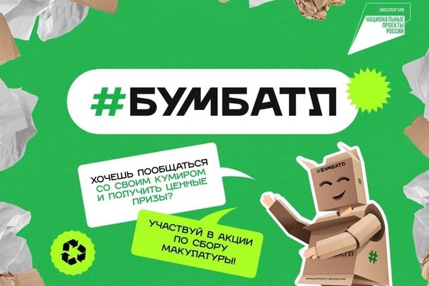 Всероссийская акция по сбору макулатуры «БумБатл» организована АНО «Национальные приоритеты» совместно со всероссийским экологическим общественным движением «Экосистема» в поддержку национального проекта «Экология» при участии Минприроды России.